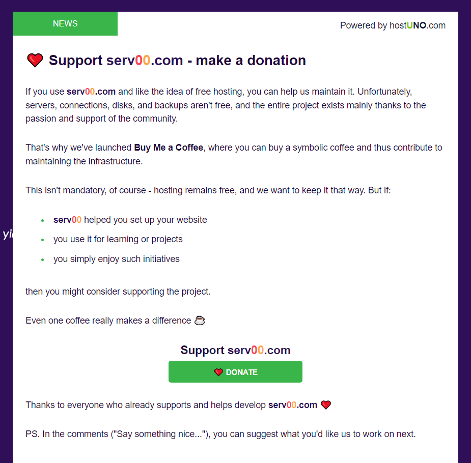 正文 怎么感觉将来serv00.com要收费 nudt V管理员 /今天/26阅读/0评论 0312 文章最后更新时间2026年03月12日,若文章内容或图片失效,请留言反馈! 🧠 独立个体 - 本文完全由人类的大脑完成 怎么感觉将来serv00.com要收费?今天收到serv00.com发来的邮件,大体意思是希望我们捐助他们。